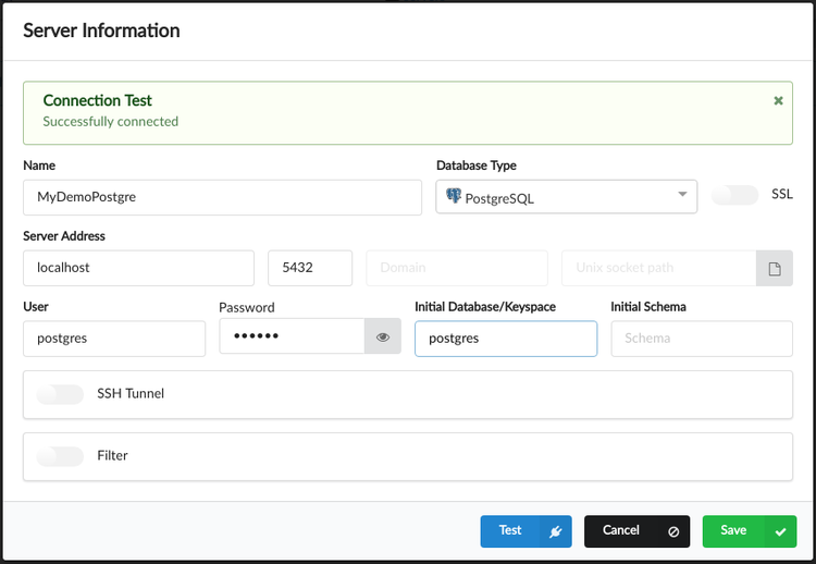 A form will be displayed on the screen. We need to use the same details that we used in our environment variables and click test to check that they work. We will have a problem because we have set the database name environment variable DATABASE_DB as «demo», and by default, Postgres doesn't have a database called demo